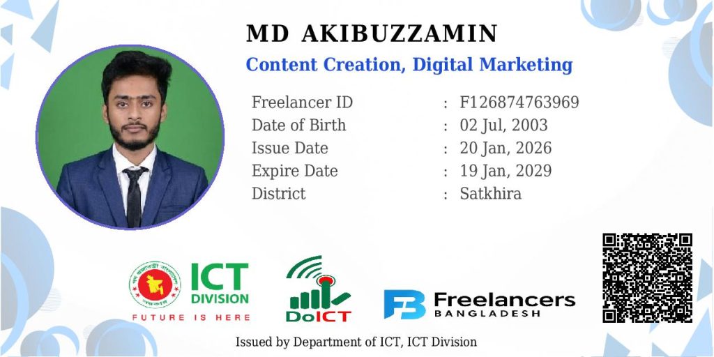 আমি Md Akibuzzamin (Akib), আমি গণমাধ্যম ও ডিজিটাল মিডিয়া / মার্কেটিং নিয়ে ৭ বছরের বেশি সময় ধরে কাজ করছি। কনটেন্ট কীভাবে মানুষের কাছে পৌঁছালে ভালো ফল আসে, সেটাই আমি বেশি গুরুত্ব দিই। Expertise : Graphic Design | Video Editing | Digital Marketing | Website Design | SEO | Audience Targeting।